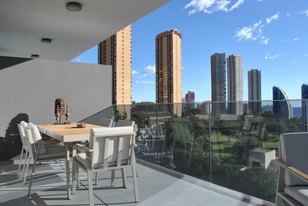 This modern designed two-storey holiday villa is located in the village of Finestrat just outside Benidorm and comprises of 2 bedrooms with fitted wardrobes and