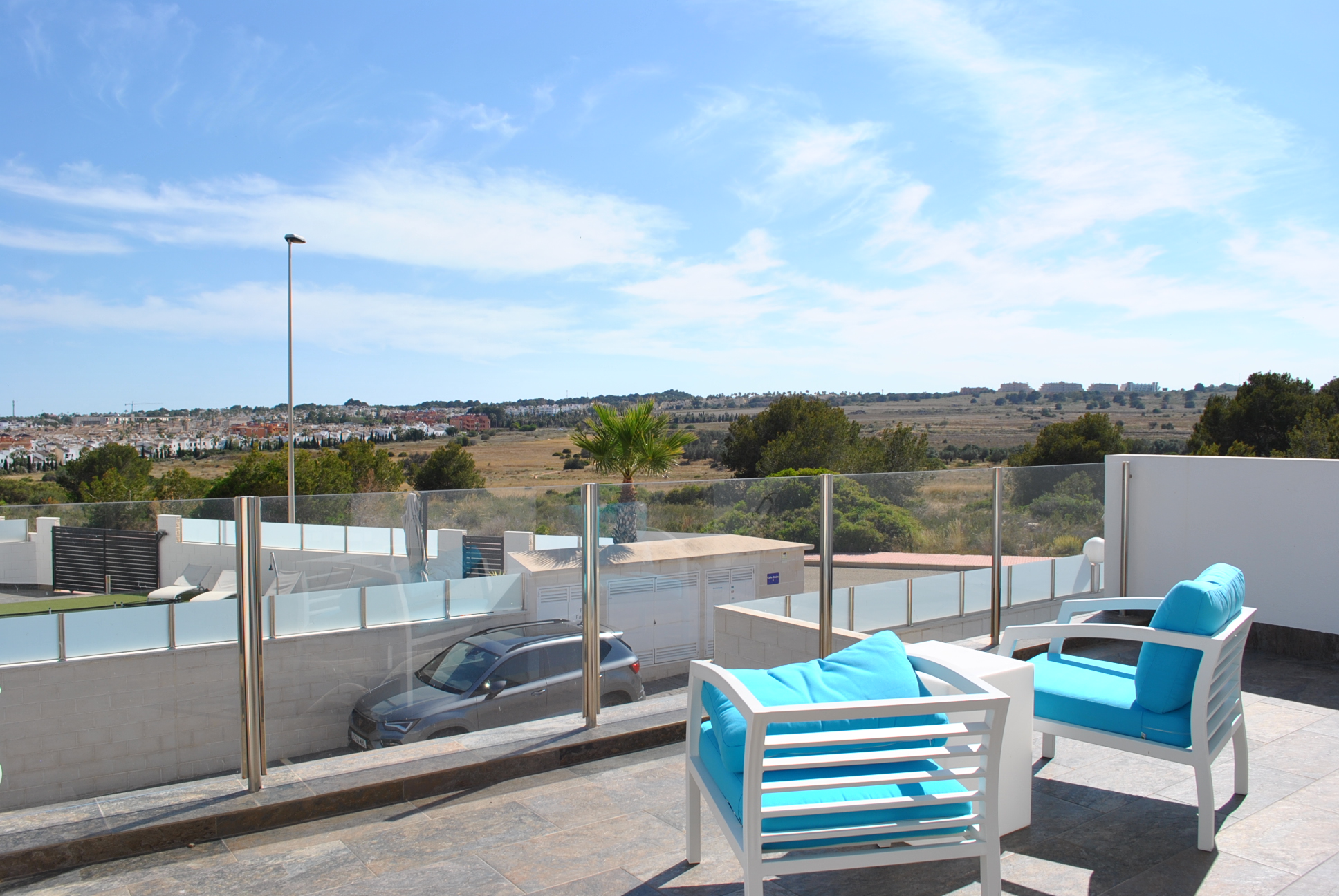 This modern holiday villa with private pool is located in a quiet and hilly area in a beautiful suburb of Villamartin on the Orihuela Costa. The modern architecture is characterized by sleek lines and large windows that maximize the natural light. The holiday villa has 2 bedrooms and 2 bathrooms, a furnished solarium, balcony and terraces. The villa has a private swimming pool of 3 x 6 meters to cool off during hot days, for example. The pool is surrounded by a fully furnished garden terrace and is ideal for enjoying the sun or organizing cozy barbecues with friends and family. The terraces offer beautiful views of the surrounding nature and from the roof terrace you have some sea views.
